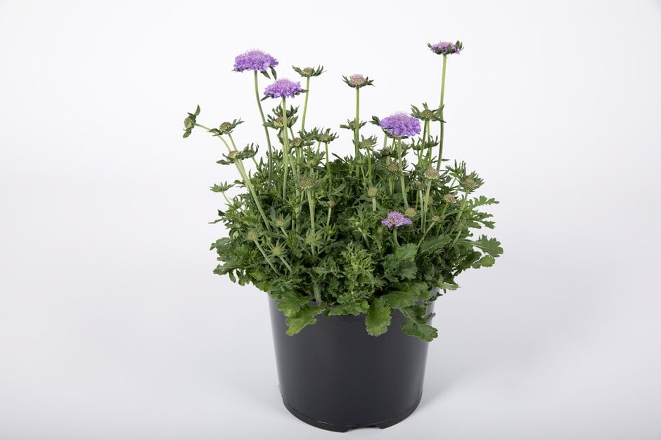 A compact, herbaceous perennial to about 50cm in flower, forming a mound of mid-green leaves and producing large, pale blue, pincushion flowers over a long period from early summer to autumn