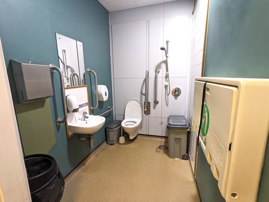 The toilet on the first floor of the Bramall Learning Centre which has grab rails, a low sink, a raised toilet bowl and an emergency alarm.