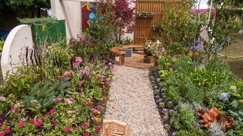 A small urban garden has been designed where young people can relax between lectures during their day at college. The key features in the space include a graffiti mural to add year-round colour and interest for students and a communal seating area. The garden has been built by young people for young people.
