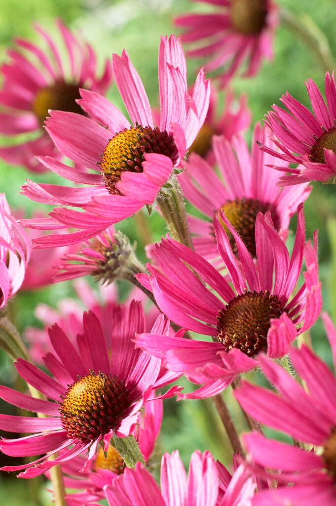 Compact, narrow-leaf, perennial coneflower species to 1.2m tall, producing upright, hairy, unbranched stems with narrow, grey-green leaves and bearing a profusion of daisy-like flowers through summer with pale pink to purple rays drooping from a central orange cone