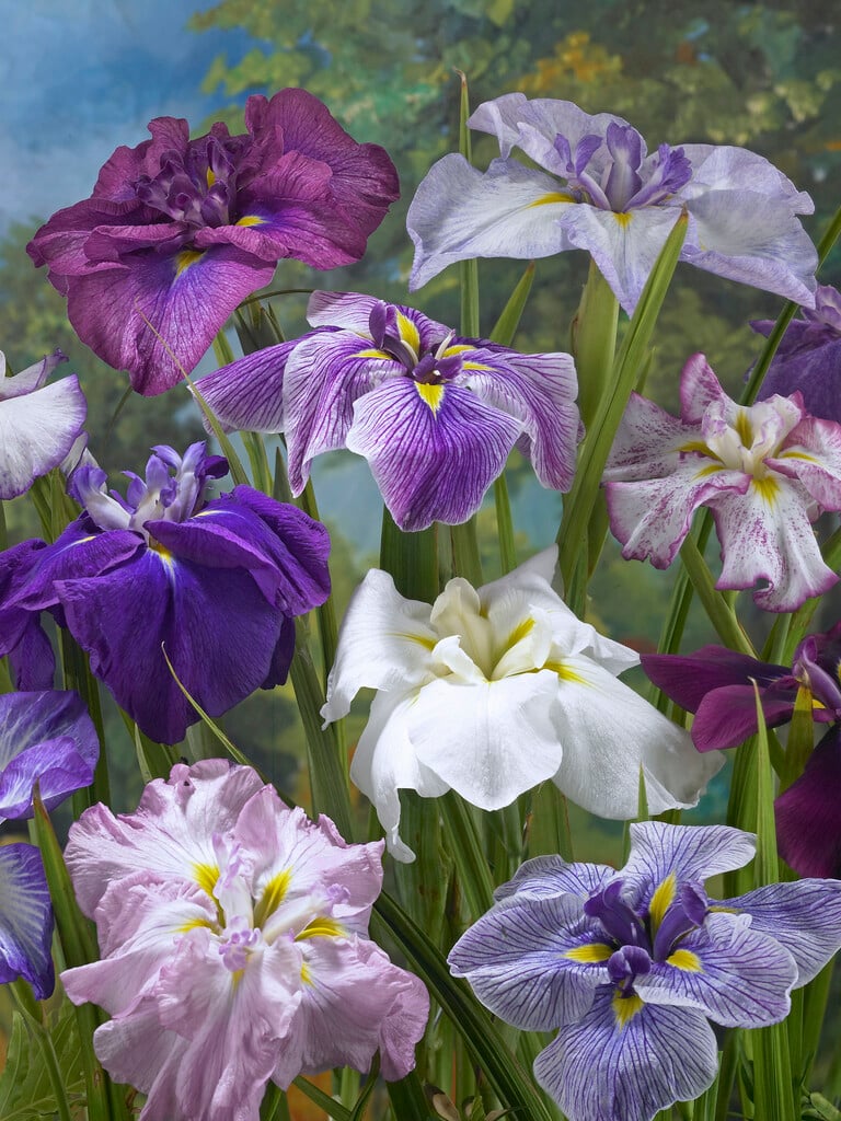 An herbaceous perennial to 80cm in height, forming a dense clump of erect foliage, with rich violet-purple flowers 10-12cm in width in mid summer, the broad, rounded falls each with a small white or yellow midrib