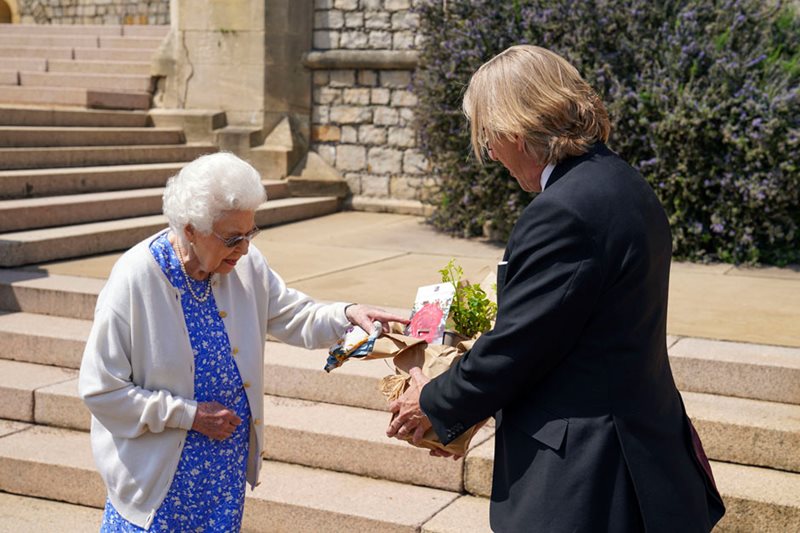 In June 2021, RHS President Keith Weed presented The Queen with a Duke of Edinburgh rose (Rosa ‘Duke of Edinburgh’), to celebrate what would have been her husband’s 100th birthday (pictured above).