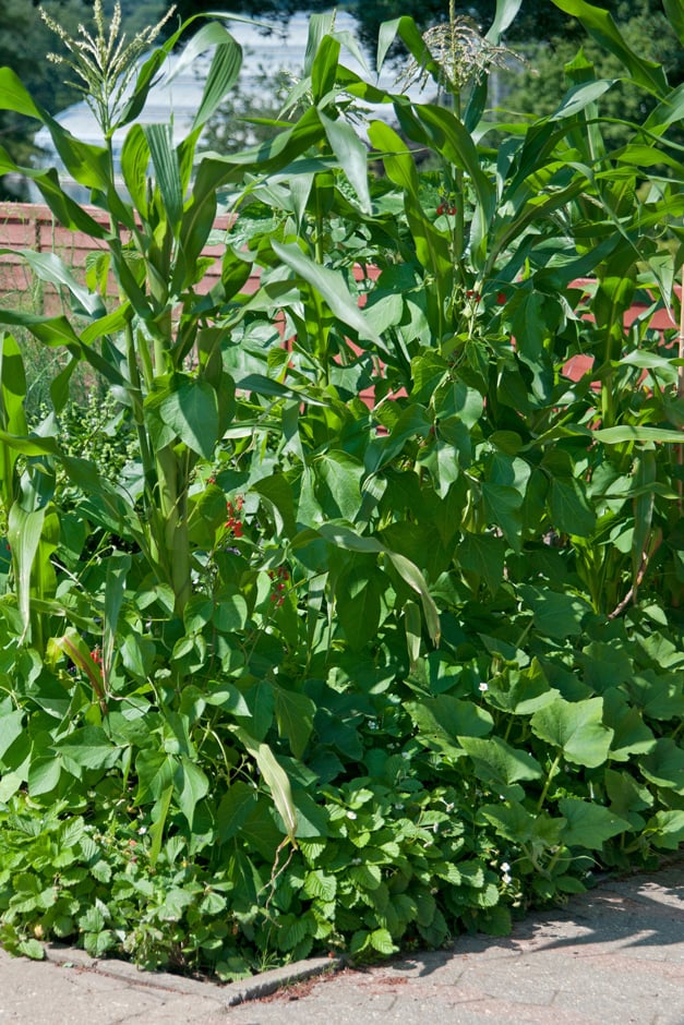 In this system the crops grow well, and very attractively, together if given sufficient space. The maize (sweetcorn) supports the beans, while the squash uses the space between the plants, shading the soil and suppressing weeds.