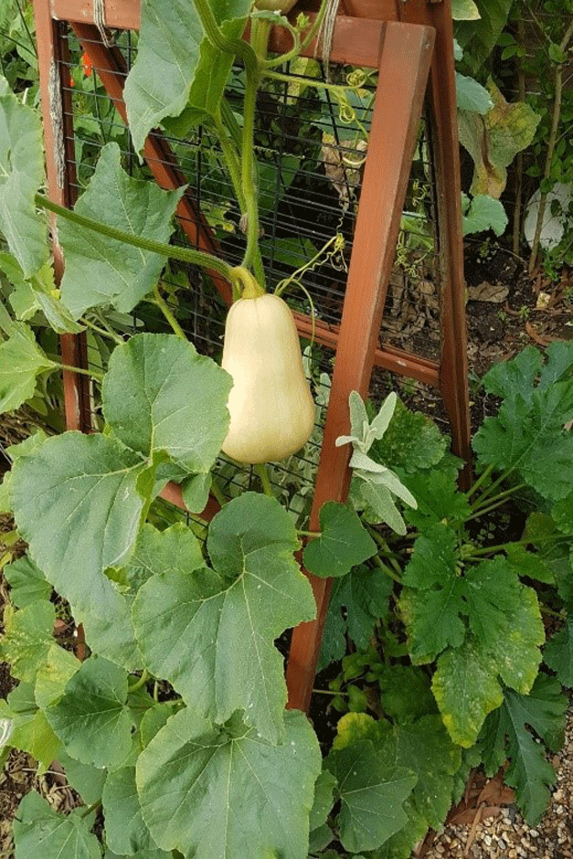 For the squashes (make sure you grow trailing, not bush cultivars), I create low A-frames constructed from the sides of an old rabbit run. The frames are sturdy, made from a mixture of wood and coated steel mesh that holds the heavy weight of developing fruit well.