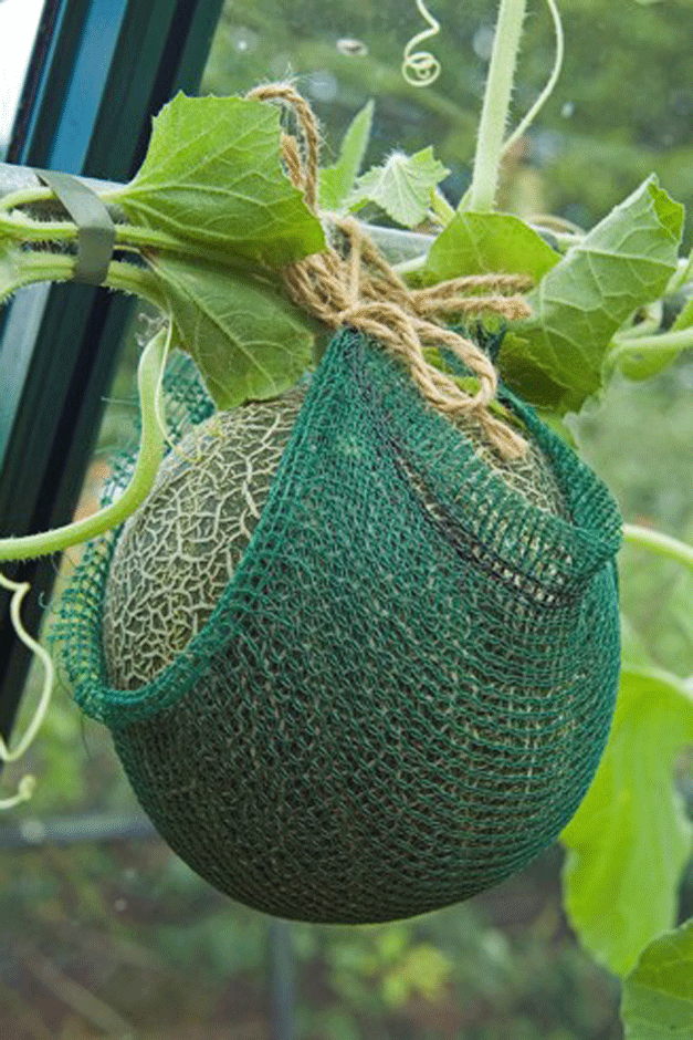 I tie plants in as they grow, but since their fruit is heavy I sometimes back this up with extra support from reused supermarket citrus fruit netting, or pieces of hessian converted into little hammocks.