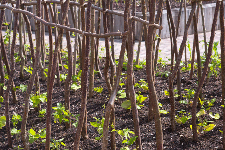 I also set up tall teepee/wigwam supports using three to four bamboo canes in the flowerbeds, to grow beans and sweet potatoes in the gaps. This adds great vertical interest in the summer, since their flowers have ornamental value even before they fruit.