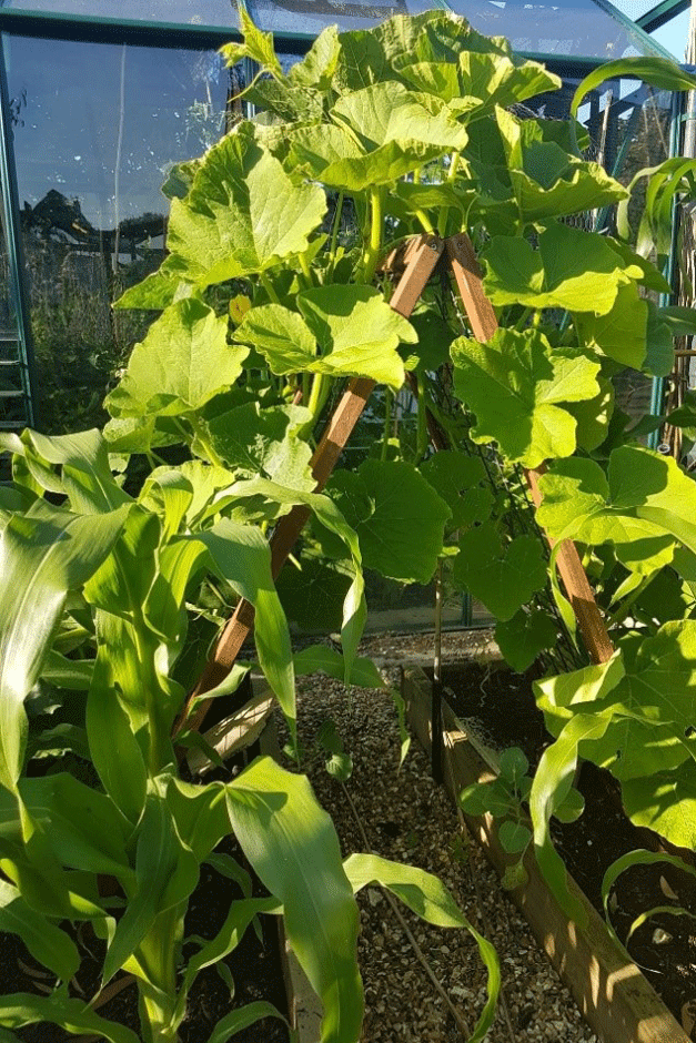 Although the frames aren’t particularly pretty, by the time the squashes get going the masses of large leaves hide the structure, and before long they look like giant pyramids of lush foliage.