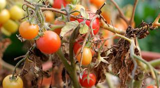Tomato blight shows itself as dark marks on stems and brown blotches on fruits with leaf rots. The plants can quickly collapse.