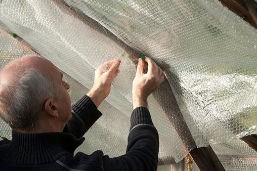 Put up insulating material such as bubble wrap on the inside of the greenhouse, if not already done.