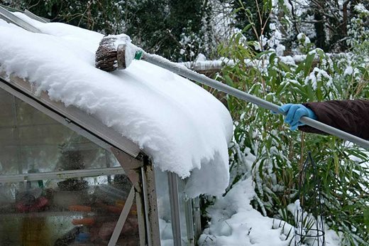 Remove snow from greenhouse and conservatory roofs, to prevent damage and to allow good light penetration.