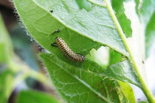 Viburnum beetle grubs can nibble holes in the leaves this month, giving plants a tattered appearance. Inspect V. tinus and V. opulus regularly and pick off the grubs by hand.