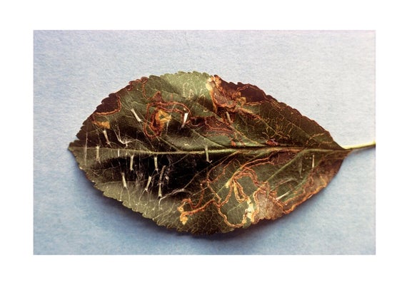 The leaf mine is a long, narrow and sinuous tunnel which can be seen as a whitish or brown line on the upper leaf surface. In late summer some apple trees can have a large proportion of their leaves mined and some leaves may contain many caterpillars. This can result in areas of some leaves dying and dropping out.