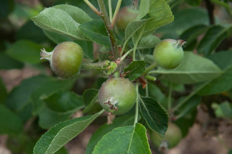 As fruits mature they produce more ethylene, which causes colour changes, an increase in sweetness and a softening of tissues. In apples, ethylene not only stimulates ripe fruits to fall, it also plays a role in shedding excess fruitlets in early summer (known as 'June drop').