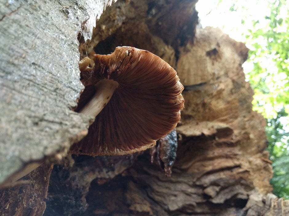 The most obvious and visible part of heartwood fungi are their fruiting bodies which are known by different names such as mushrooms, brackets (shelf-like structures), oysters, fans, crusts etc. These are the sexual reproductive structures of fungi and their function is to produce spores. Spores are released from a fruiting body to be dispersed by wind or animals. After landing on a tree they germinate and start producing hyphae (filamentous structures) which form the mycelium – the main body of a fungus. The formation of mycelium happens inside the tree, in its heartwood, and so it is hidden to the naked eye and often the fruiting bodies are the only visible indication of its presence in the tree.