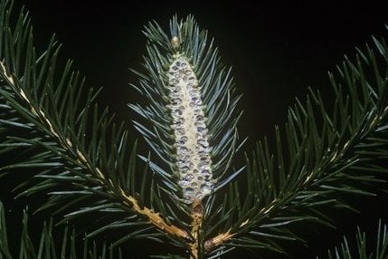 Balsam woolly adelgid, Adelges piceae. This adelgid is found on firs, Abies species. Found on the woody parts of the plant, the white waxy ‘woolly’ areas can become extensive. Large populations can cause buds to fail and twigs to enlarge, a symptom sometimes called gout disease. This insect is becoming more frequent in Britain.