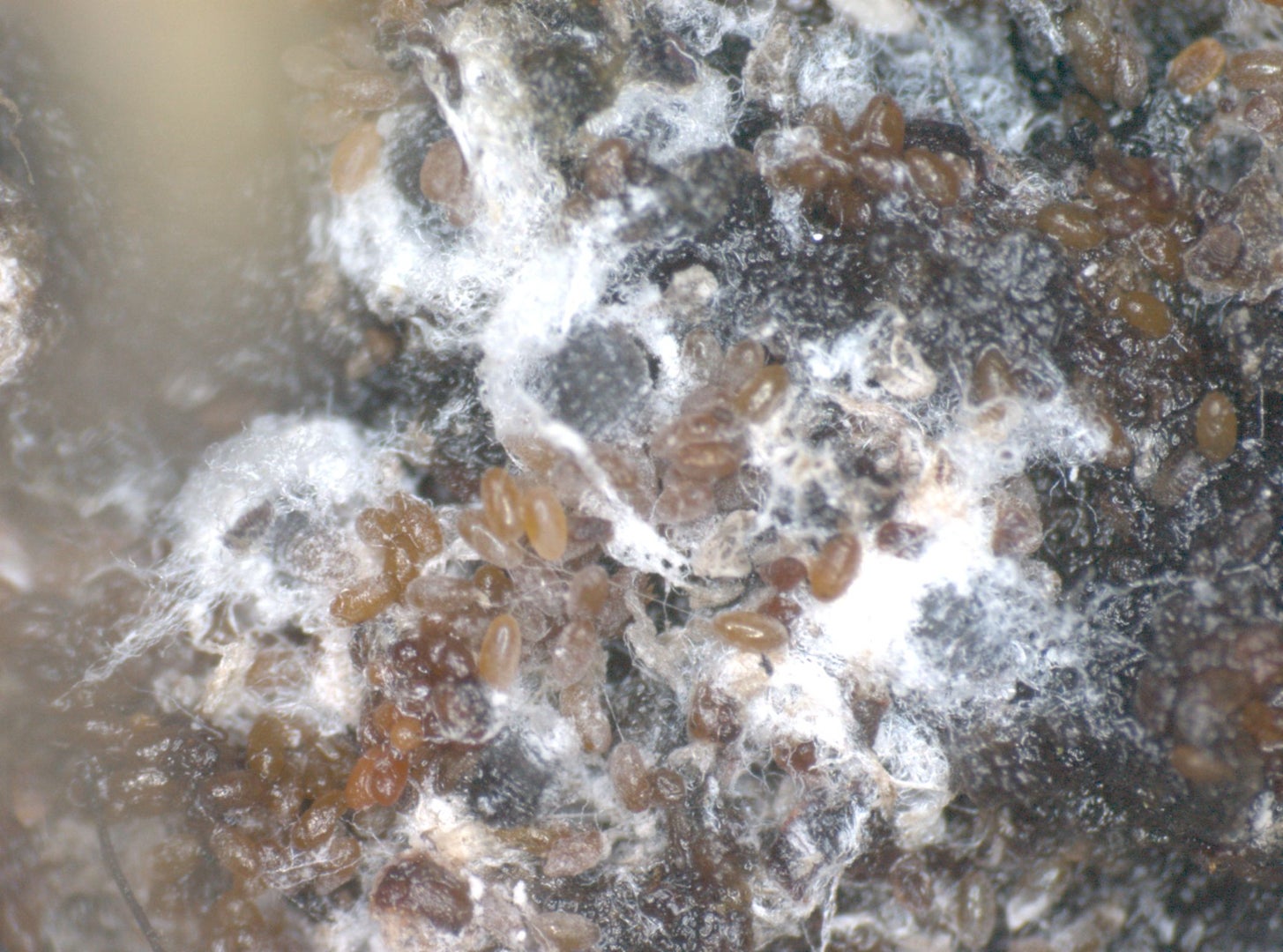 Douglas fir adelges, Adelges cooleyi. A of North America which has become widely established in Britain. It alternates between spruce (Picea) and Douglas fir (Pseudotsuga menziesii). It can be most noticeable on Douglas fir where foliage can become encrusted in white fluffy wax, sooty moulds and can become mottled. On spruce the adelgid causes galling which can affect the growth of new shoots. The adelgid lays eggs in the spring on Douglas fir. The nymphs soon hatch and feed on the needles producing large amounts of white wax and honeydew. The adult females are less than 2 mm in length and reddish brown to black, both winged and wingless forms occur. In early summer the winged forms migrate to spruce where they produce a generation that overwinters. In spring the overwintered generation induces elongate galls on spruce, this generation matures in the summer producing winged females that migrate to Douglas fir and overwinter, laying eggs in the spring.