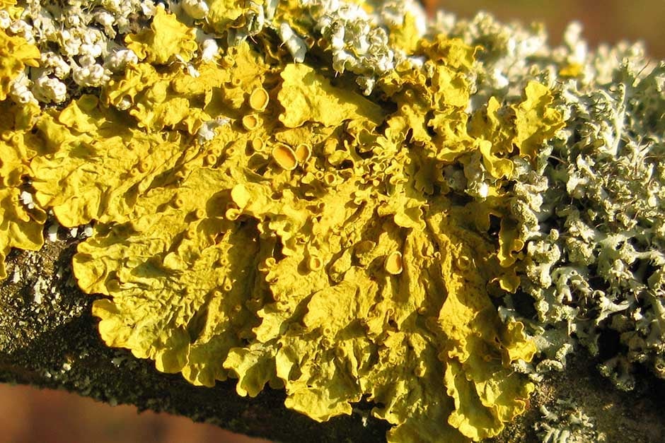 A lichen is not a single organism; it is a symbiotic (mutually beneficial) association between a fungus and an alga, or a fungus and a cyanobacterium. There are more than 2,000 species of lichens in the British Isles; some are very rare and are restricted to specific sites, but most gardens have at least a few species. Lichens can be found on trunks, stems and branches of trees and shrubs, on paths, patios, paving and walls, and less commonly in lawns. Most lichens are silver-grey, grey-green, yellow or orange. Those that appear on trees and shrubs are often green or grey.