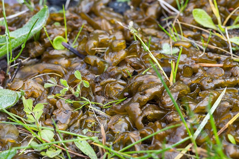 Algae-like Nostoc grow on gravel, tarmac, concrete paving and soil. They are cyanobacteria (bacteria that photosynthesises) but are often mistaken for algae. Nostoc species seen in gardens form greenish, jelly-like growths after rain, which become black and crusty when they dry out. Its strange appearance is reflected in its common names, which include star jelly, witch’s jelly and troll’s butter.