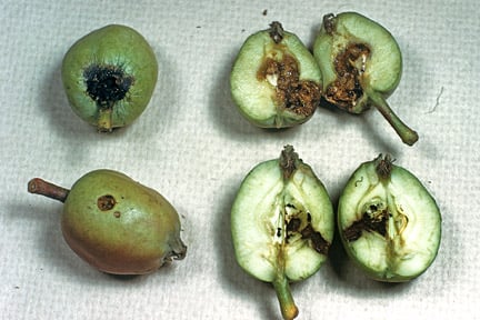 - Fruitlets that suffered only initial feeding damage by a larva can stay on the tree and develop as fruits. These fruits are usually misshapen and have a long ribbon-like scar about 4 mm wide, often starting at the eye end of the fruit and extending around the circumference. The fruit is usually still edible when this occurs