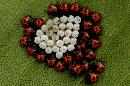 Adults overwinter in natural shelters such as cracks in tree , or in buildings and become active during spring when they start feeding on woody plants. After their emergence, they mate and the female insects lay clusters of eggs on the underside of leaves. The nymphs (five different instars) feed on plant tissues such as leaves, fruits and seed pods. Adults may start appearing in late summer and autumn.