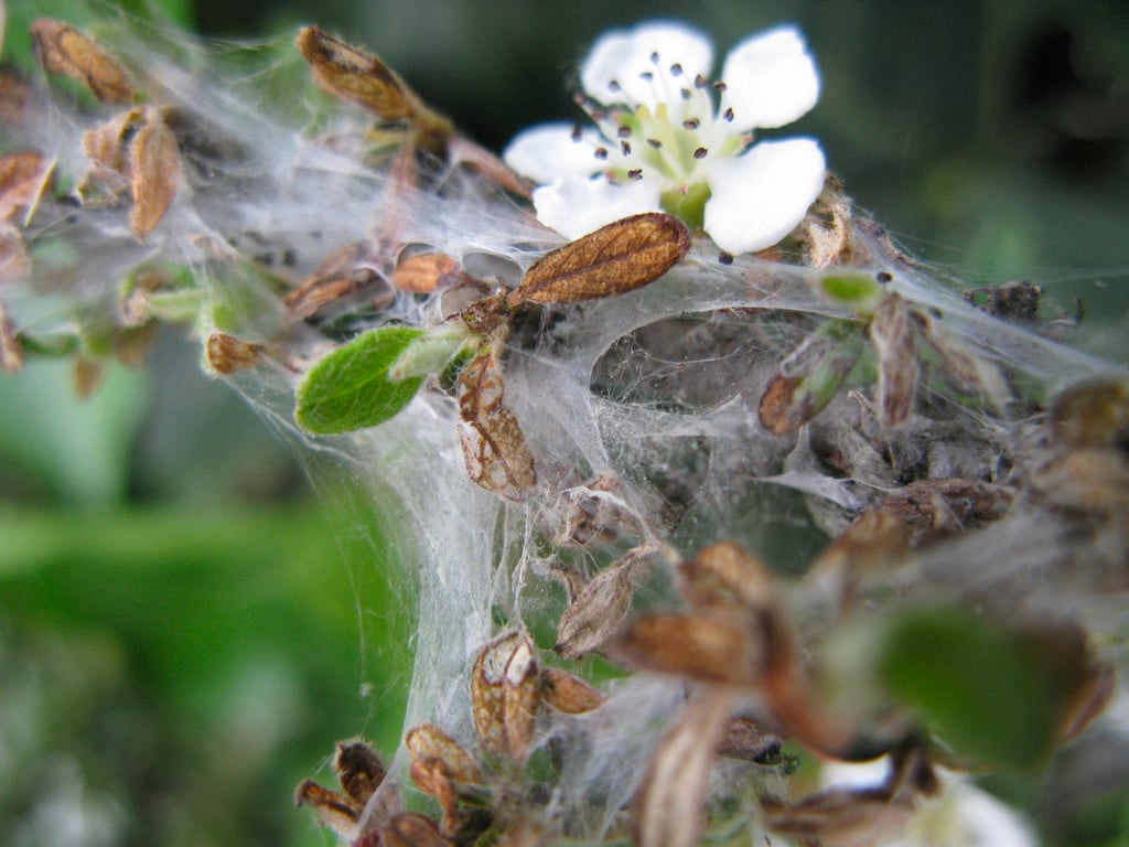 - Hawthorn webber moth larvae cover their feeding area with extensive sheets of fine white silk webbing