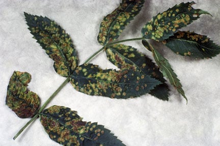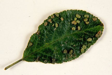 Mountain ash blister mite (Eriophyes pyri): Whitish or yellowish-green blistered patches 2-4 mm in diameter on the foliage of Sorbus aucuparia in late spring. Later in the summer the galled areas become brownish-black. Other gall mites cause similar symptoms on other Sorbus spp., hawthorn and apple. Also occurs on Pear when it is known as pear blister mite.