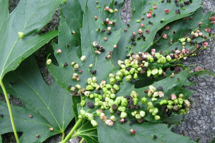 Sycamore/maple pimple gall mites (Aceria spp.): Several species of gall mites cause small reddish swellings on the upper leaf surface.