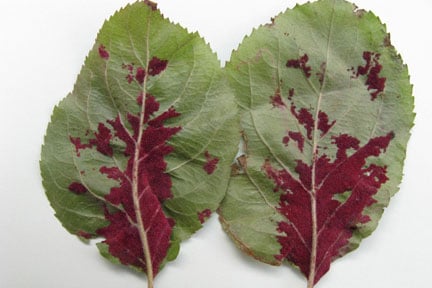 Apple felt gall mite (Phyllocoptes malinus) Creamy-white or reddish-purple patches of hairs on the undersides of edible and crab apple leaves.