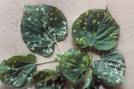 Lime felt gall mite (Eriophyes leiosoma and Phytoptus erinotes): Patches of creamy-white hairs on the undersides of leaves and upward bulges on the foliage.