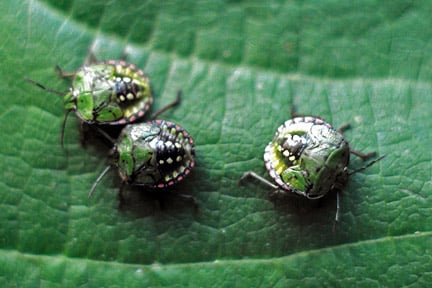 - The nymphs of southern green shieldbugs are green or black with many white, yellow or pinkish-red circular markings on their upper surface