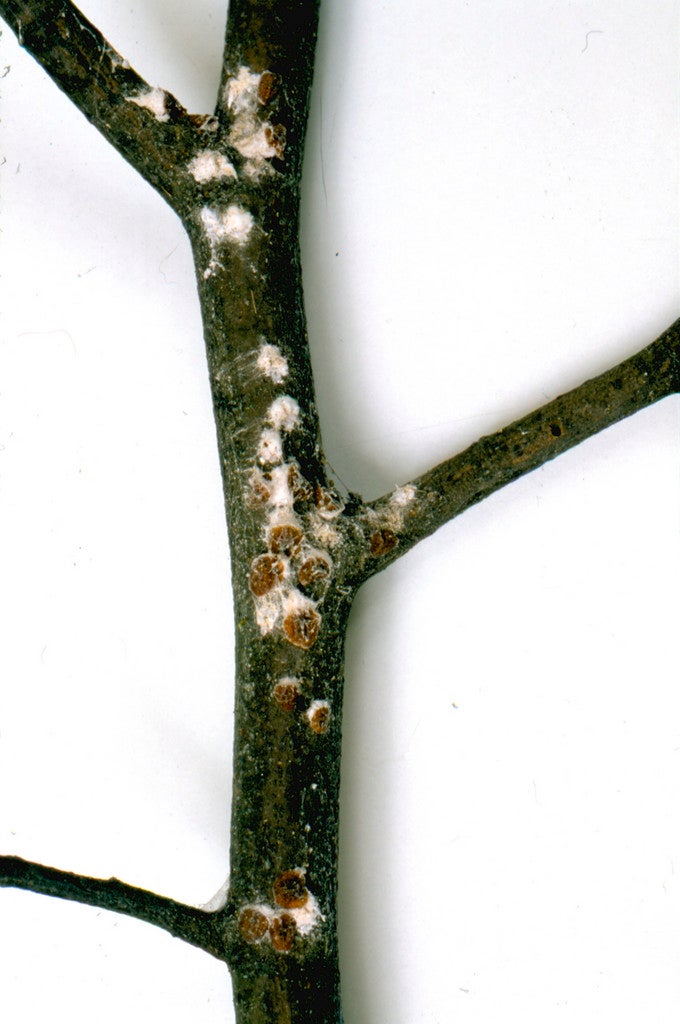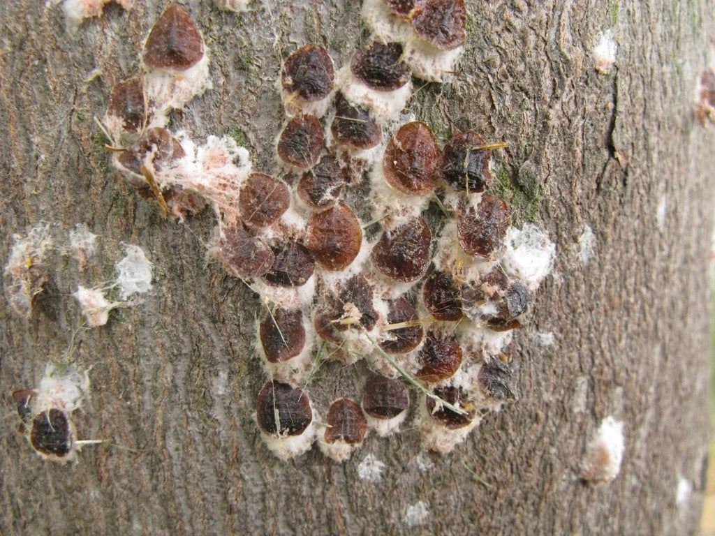 - After the adult insects have died, the scale often falls off or is blown away, leaving circular white egg masses, 5-6 mm in diameter, on the bark