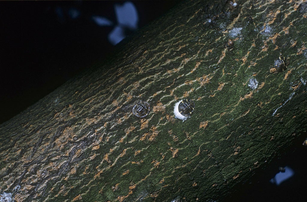 In autumn, they move to the and overwinter. At that time they are difficult to see, as they are flat, oval scales about 1 mm long and closely matching the colour of bark. They remain on the bark and resume feeding in spring.