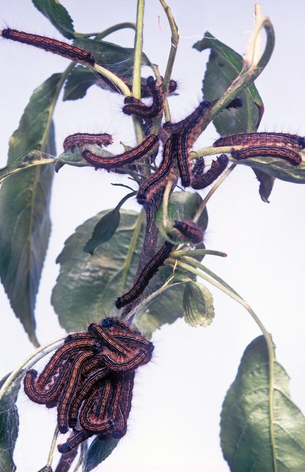 Main symptoms - Defoliation, webbing and orange, white and blue striped brown caterpillars