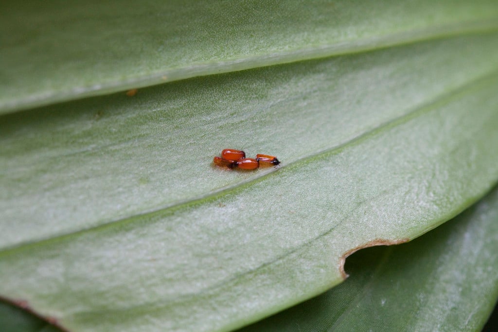 - Clusters of orange-red, sausage-shaped eggs on the undersides of leaves