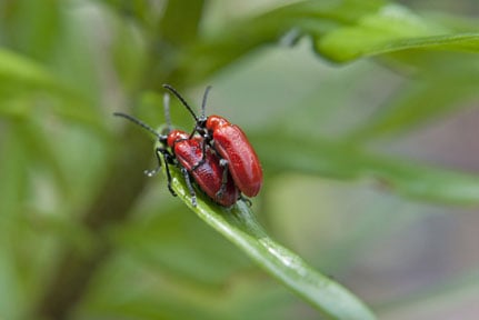 Lilies and fritillaries can tolerate some damage from this insect. However, in some cases, plants can be stripped of all foliage, which can affect the health of the bulb. The adult beetles overwinter away from host plants.