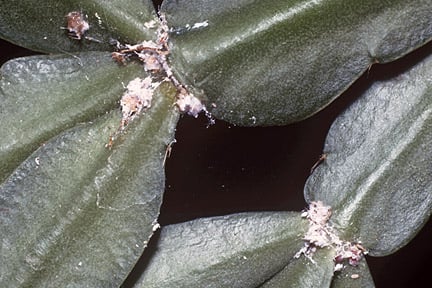 • Glasshouse mealybug is usually first noticed as a fluffy white wax produced in the leaf axils or other sheltered places on the plant. The insects or their orange-pink eggs can be found underneath this substance