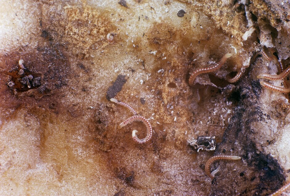 Millipedes feed mainly on decaying plant material and the associated fungal growth. They will occasionally damage and other soft growth, such as strawberry fruits, although damage is usually initiated by other animals such as slugs. Millipedes, especially the spotted snake millipede, are sometimes found feeding inside , potato tubers and on other root vegetables. In this situation, they are enlarging damage initiated by slugs or some other animal or a disease. The relatively weak mouthparts of a millipede will make little impression on healthy undamaged bulbs, roots or tubers.