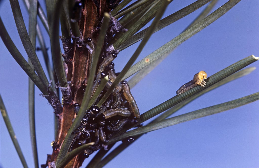Pine adults are active in spring and the females lay eggs in slits they make with an egg laying organ (ovipositer) in the needles. The larvae hatch after a few weeks and feed in groups on the needles. These larvae will lift their abdomen off the plant in a group as a defensive posture when disturbed. The larvae are usually fully grown by July where they spin brown cocoons on the foliage or on the ground beneath the plant. New adults emerging in July or August and can produce a second generation of larvae that feed in late summer and autumn. The autumn generation spins cocoons in soil or leaf litter, pupating in the following spring.