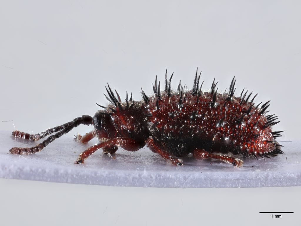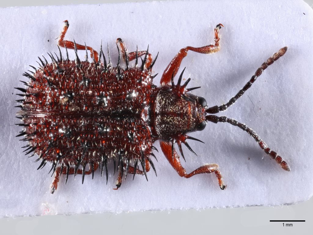 Rockrose prickly leaf beetle is a 5 mm long, brownish-red, leaf beetle with black spines. It feeds on plants in the rockrose family Cistaceae, especially the genus Cistus. The spines give it an appearance unlike any other beetle found in Britain.