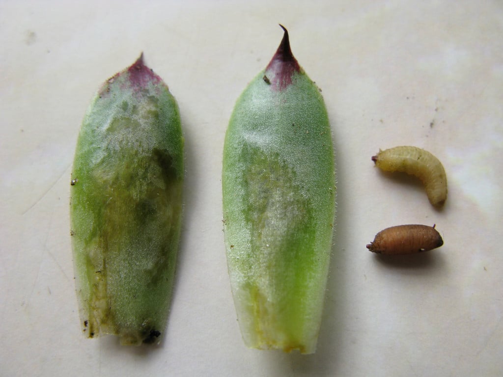 Over-watering or poor drainage can cause similar symptoms to sempervivum leaf miner, however closer examination should reveal the presence of plump whitish maggots, up to 8-10 mm (about 3/8 in) long, inside some of the damaged leaves.