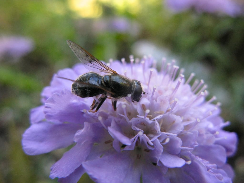 Hoverflies are true flies and belong to the order Diptera, family Syrphidae. There are more than 6000 species of fly in Britain of which over 280 are hoverflies. Hoverflies get their name from their ability to hover in mid-air. Many hoverflies mimic wasps, honey-bees or bumble-bees with stripes, bands and markings of black and yellow. Sempervivum leaf miner is a small bluish grey species. Adult hoverflies are pollinators and the larvae of most species are predators or help recycle organic matter (detritivores), very few feed on living plant material. Read more about hoverflies.