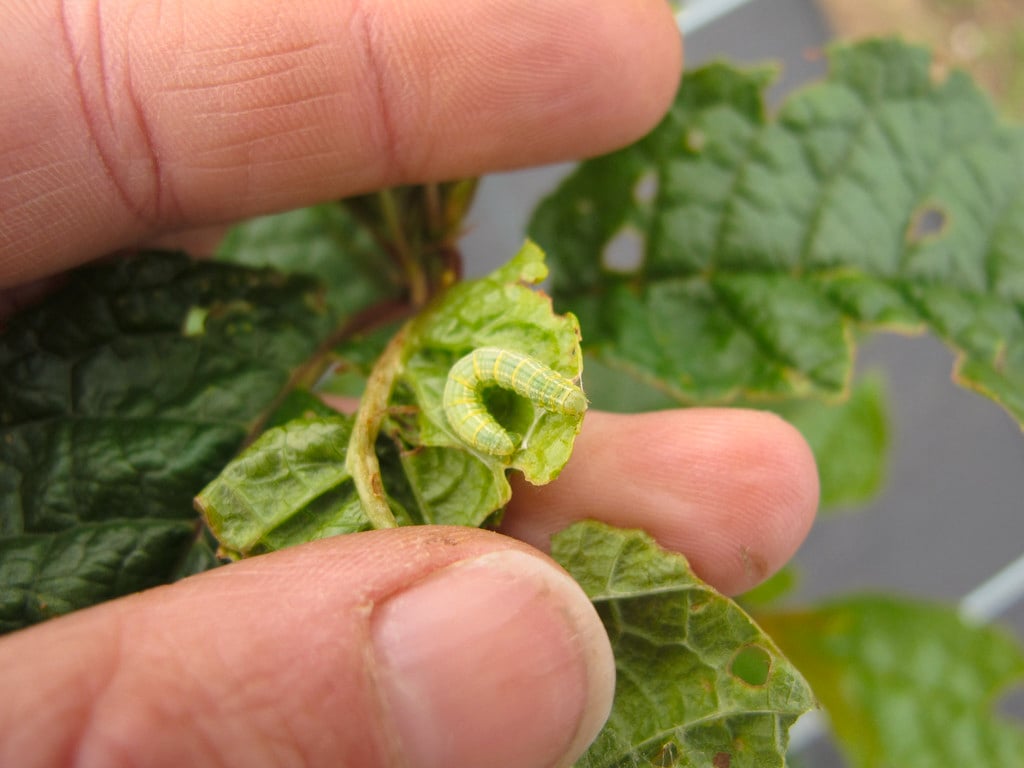 Eggs hatch at burst and the pale green looper-type caterpillars emerge and start feeding. The caterpillars are up to 25 mm (about 1 in) long and complete their feeding by early June. They then go down into the soil where they pupate.
