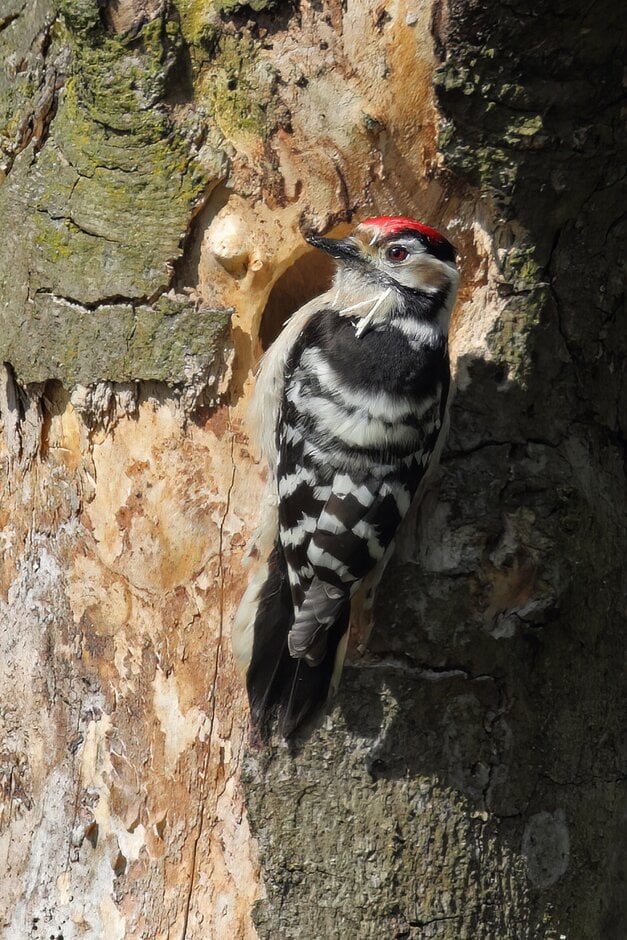 The lesser spotted woodpecker can be found in the tops of trees, searching for a range of invertebrates including, spiders and wood-boring insects on smaller branches. Similar in appearance to the great spotted woodpecker; it is differentiated mainly by size being much smaller (the size of a house sparrow). It is however, now a rare sight in the UK. This once-abundant species is now amongst the UK’s most rapidly declining birds and is on the UK Birds of Conservation Concern Red List.