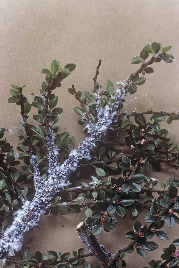 Woolly aphid is a black aphid that sucks from woody stems of apple, cotoneaster and pyracantha and covers itself in a white waxy secretion.