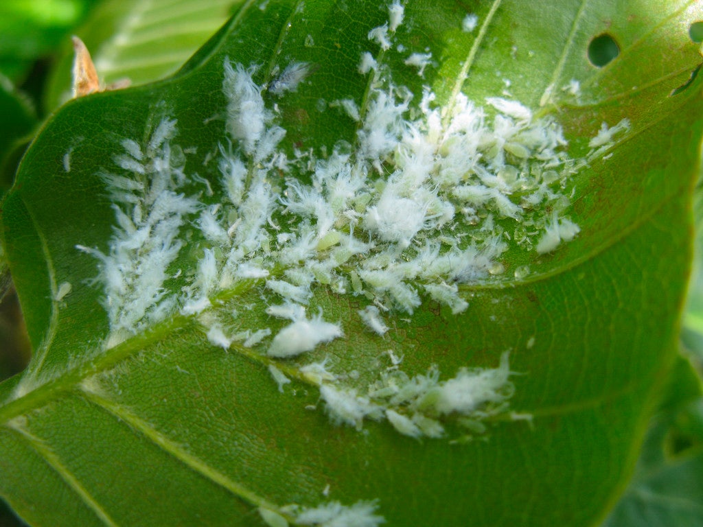 The pale yellow aphids suck from the underside of leaves and can form dense colonies that are hidden under a white waxy fluff that is secreted by the aphids. They also excrete a sugary honeydew that makes the foliage sticky and encourages the growth of . Heavily affected leaves may be distorted but otherwise the tree’s growth is unaffected.
