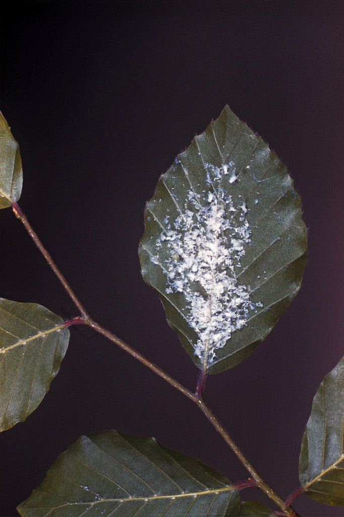 - In late spring, fluffy white patches appear on the underside of beech leaves
