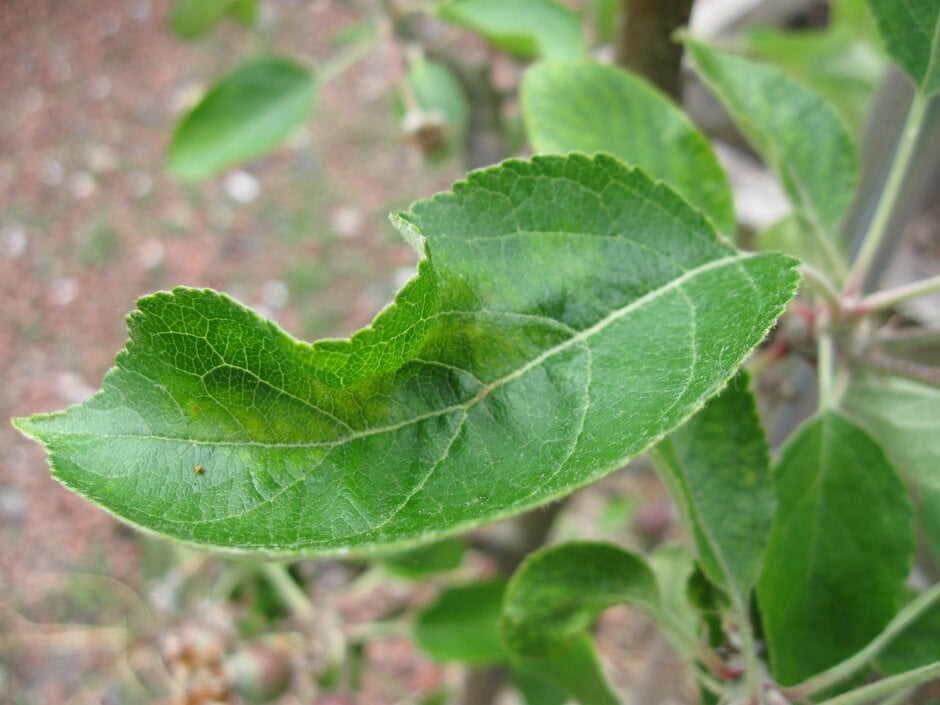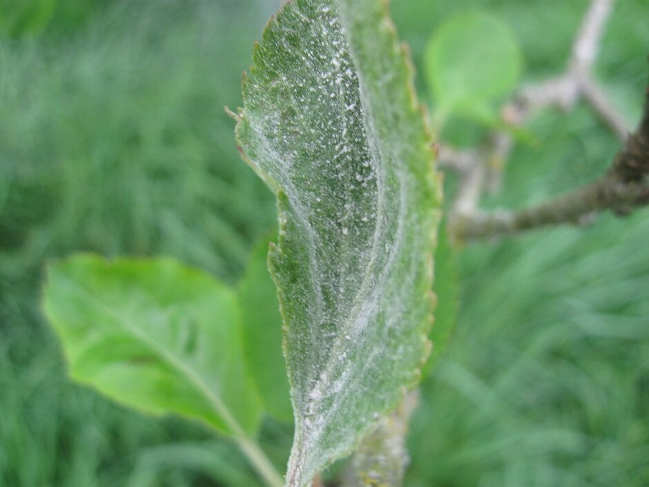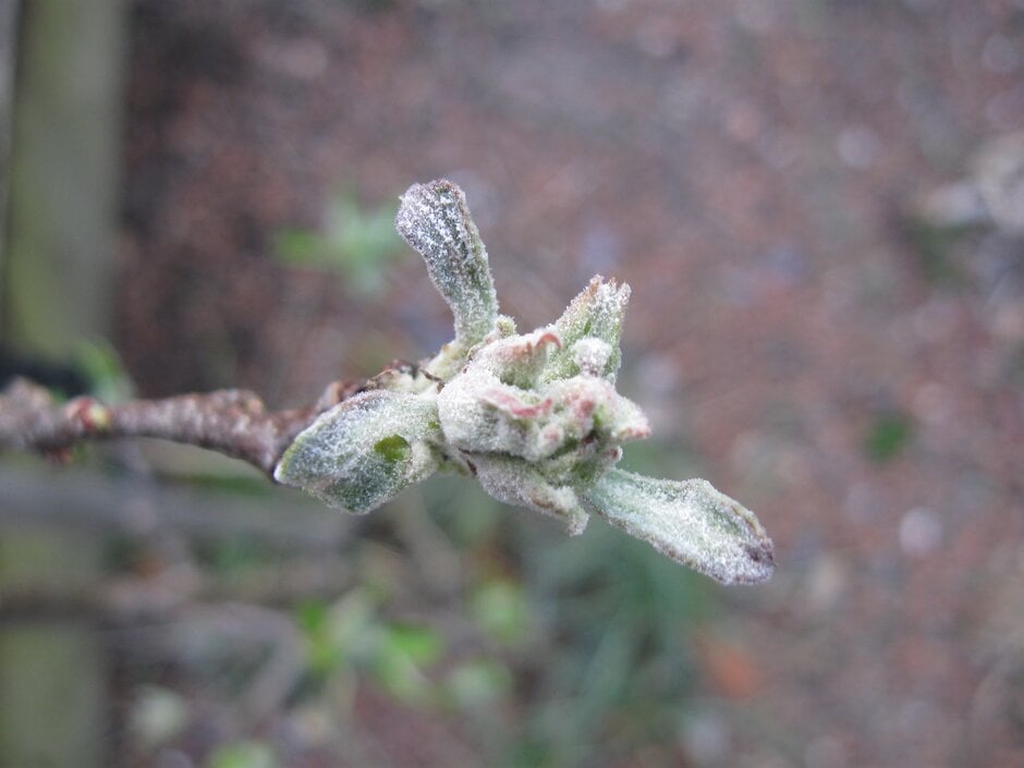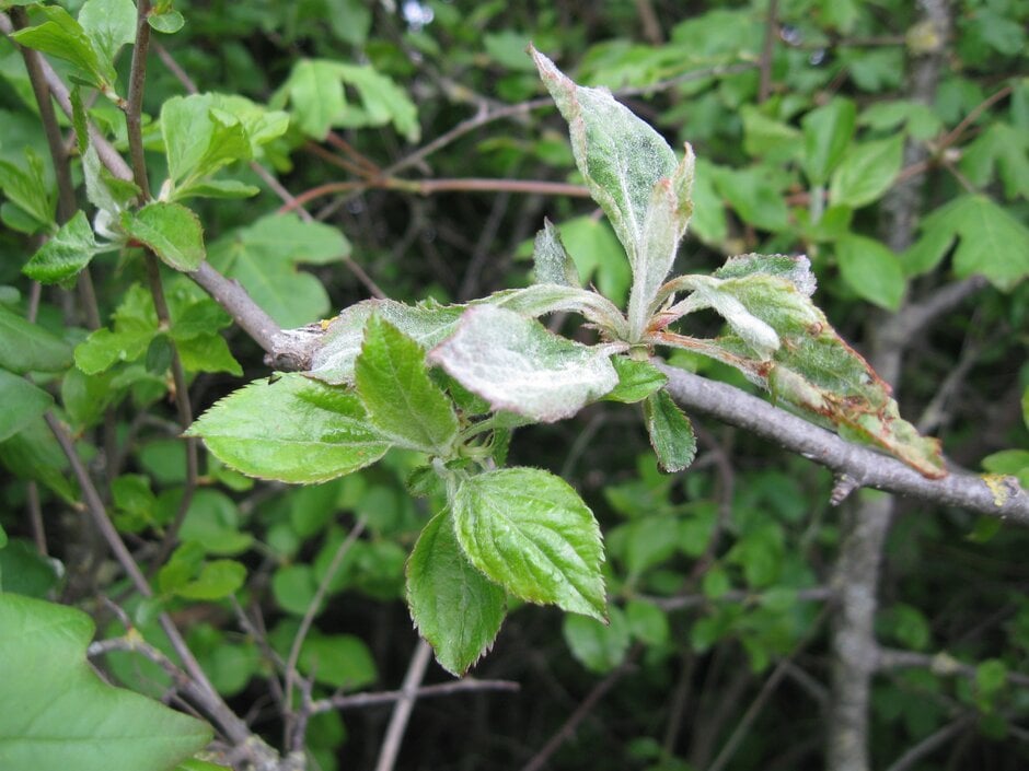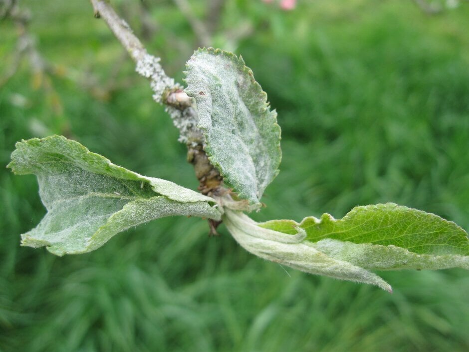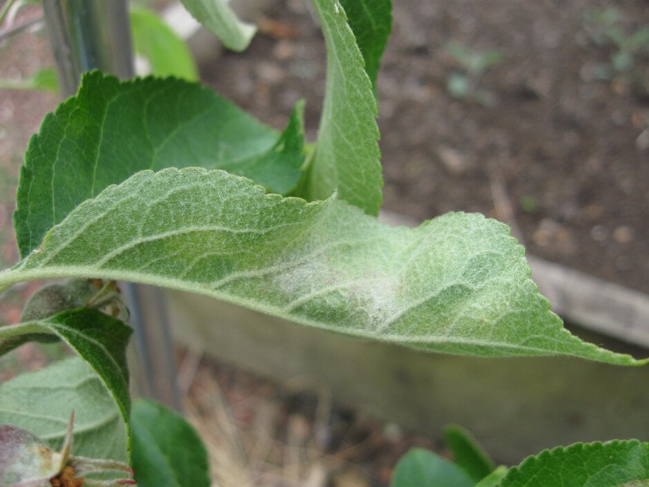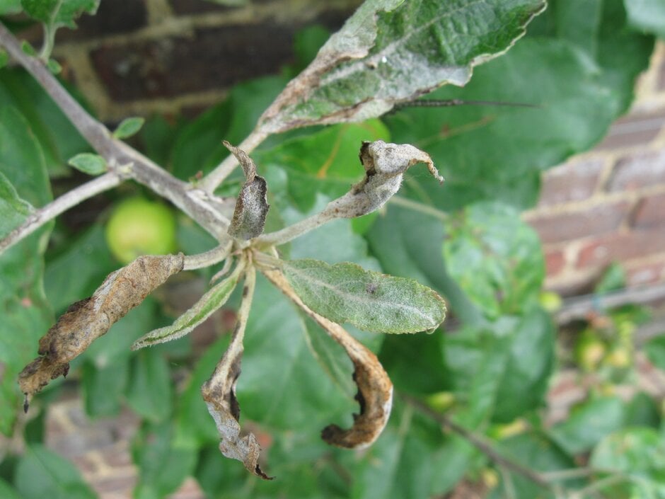 Finally, some apple cultivars naturally produce a dense white covering of hairs on the leaves and young twigs. These hairs can make the growth of secondary mildew on the leaves difficult to spot, whilst on the twigs in winter they could be mistaken for the silvering caused by overwintering powdery mildew.