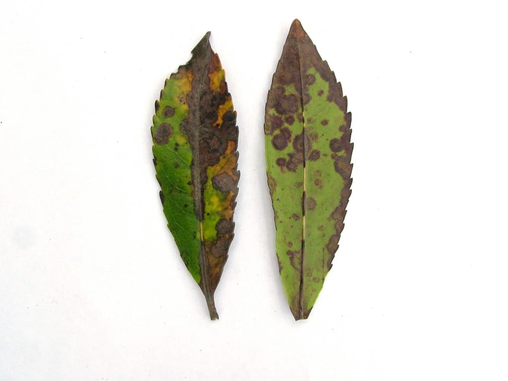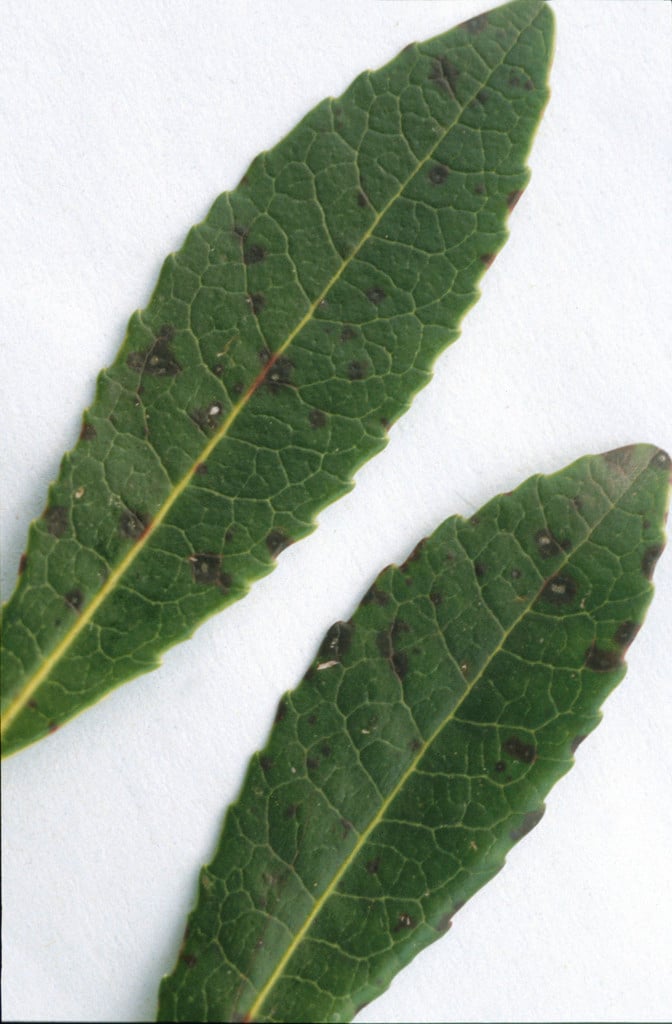 Leaf spots on arbutus are usually caused by one of two fungi. Elsinoë mattiroloanum is the more common and damaging, may be found on twigs as well as leaves, and can lead to leaf loss and twig dieback. Attacks by Ruptoseptoria unedonis are usually confined to the leaves.