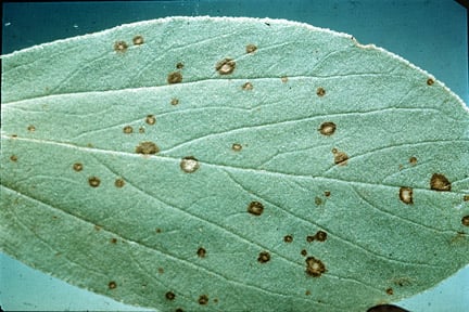 Under dry conditions the pathogen remains contained within the small round spots, but under wet conditions it spreads outwards and the lesion expands rapidly. Alternating wet and dry weather may lead to a spot with a series of concentric growth rings, but in longer periods of wet weather the leaf is rapidly killed.