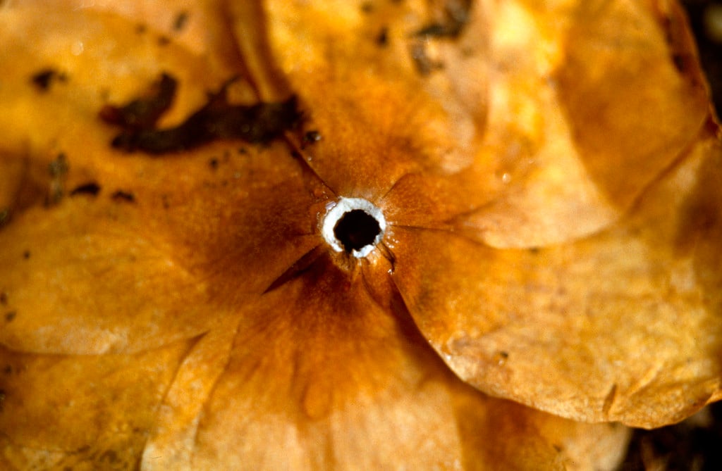 - Hard black resting structures (sclerotia) of the fungus may be found embedded within the base of the petals